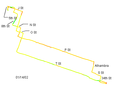 [brian@laptop gps]$ rideplot --color --brush-width=2 --speed-cutoff=25 \ < tracklog-20020114a > /dev/null total distance: 10.47km / 6.51mi maximum speed: 35.79Km/h / 22.24mph 9 points omitted due to speed cutoff